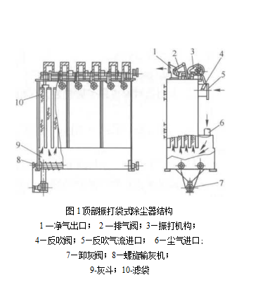 頂部振打袋式除塵器主要由箱體.灰斗和振打機構等組成除塵器內裝有電熱器.可在低溫或含濕量較大的條件下使用與頂部振打式相比.中部振打式對濾袋的損傷較小.