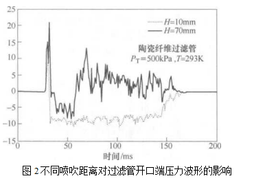 Berbner[ 39]等人通過測定陶瓷纖維 過濾管上部位置的內外壓力波形,認芝為噴吹距離(脈沖反吹噴嘴與過濾管開口端面之間的距離)對壓力波形的振蕩和負壓區域有重要影響。如圖2所示,當噴吹距離過小時,過濾管內開口端位置負壓持續時間顯著增加Grannell[40]等在由單根陶瓷纖維過濾“ 管組成的實驗裝置上,分析了噴吹距離和引射器結構形式對濾管內外壓力置附近不產生負壓引起過濾管外氣體抽吸到內部為判斷準則,確定最佳噴吹距離。