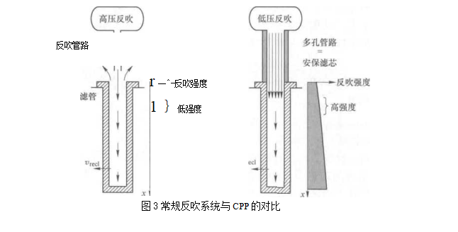 CPP 中噴吹管直徑變大,噴嘴與過濾管斷面之間的連接段為多孔管,其作用類似一個常用的失 效安保濾芯。顯然,在過濾管開口端位置附近,CPP比常規脈沖反吹系統的反吹強度明顯 增加,沿過濾管長度方向反吹強度的均勻性更好。